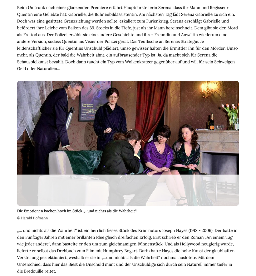 unser Herbststück "Willkommen in Woche fünf" ist abgespielt und wir freuen uns, dass es bei unserem Publikum wie auch der Kritik gut ankam! Jetzt stecken wir schon wieder in den Proben für unser Frühjahrsstück. Was wir proben wird noch nicht verraten. Nur so viel: es ist ein Klassiker - Abwechslung muss schließlich sein.