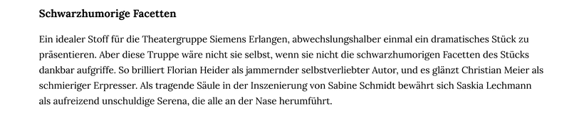 Gerade solche Vorlagen sind oftmals echtes Futter für Laien-Gruppen. So auch hier. Und dann doch wieder – ganz erstaunlich: Da kommen die Amateure der Siemens-Theatergruppe daher, lernen all